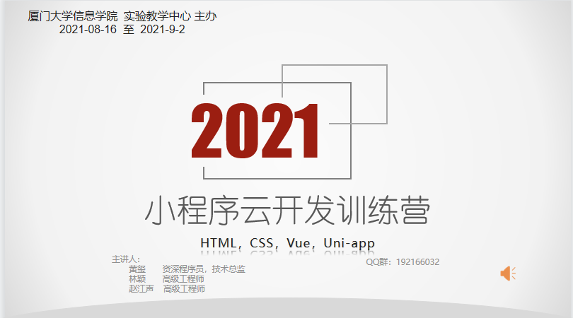 小程序正成为各类软件设计大赛重要的作品方式,云开发是当前极为热门的技术。为此,厦门大学信息学院特在2021年暑期推出公益性质的小程序云开发线上训练营,免费向广大厦大学生开放。训练营邀请到具有丰富项目经验的技术总监黄玺,以及信息学院实验教学中心实战和教学经验都十分丰富的林颖高级工程师和赵江声高级工程师,为同学们讲授从网页设计到小程序云开发等实用技术。