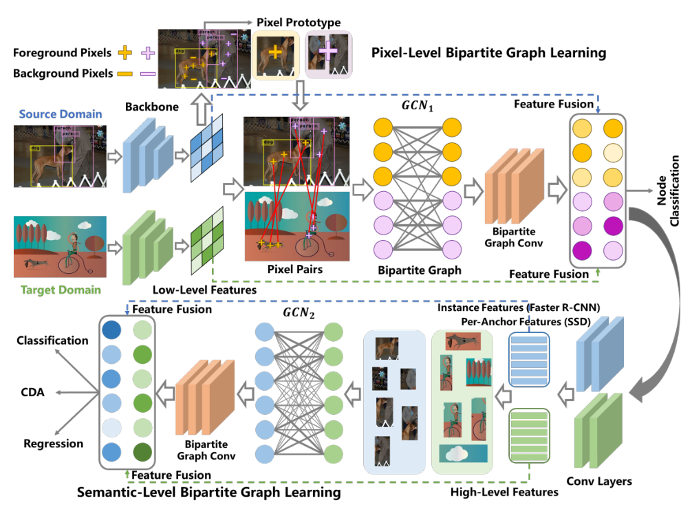 本文的第一作者是香港大学陈超奇博士,通信作者是信息学院信息与通信工程系黄悦副教授和香港大学俞益州教授。主要解决由于域之间的分布差异导致跨域目标检测性能下降的问题。域自适应目标检测(DAOD)通过将从标记的源域学到的知识转移到新的未标记的目标域来减轻了对大规模标注数据的依赖。最新的 DAOD 方法通常寻求域对抗训练中局部特征对齐结合特定的目标检测模型来实现细粒度特征对齐。然而,这些方法受限于适应特定类型的目标检测方法,而没有探索跨域之间的拓扑关系。本文首先将DAOD定义为一个开放集的域自适应问题,其中前景(像素或区域)被视为“已知类”,而背景(像素或区域)被视为“未知类”。为此,我们为DAOD提出了一个新的通用的视角,称为双重二部图学习(DBGL),它通过增加前景和背景之间的鉴别性来捕捉像素级和语义级的跨域交互以及建模不同语义类别之间的跨域依赖性。实验表明,所提出的DBGL与单阶段和双阶段目标检测的结合方法在标准DAOD基准上超越现有先进方法的性能。