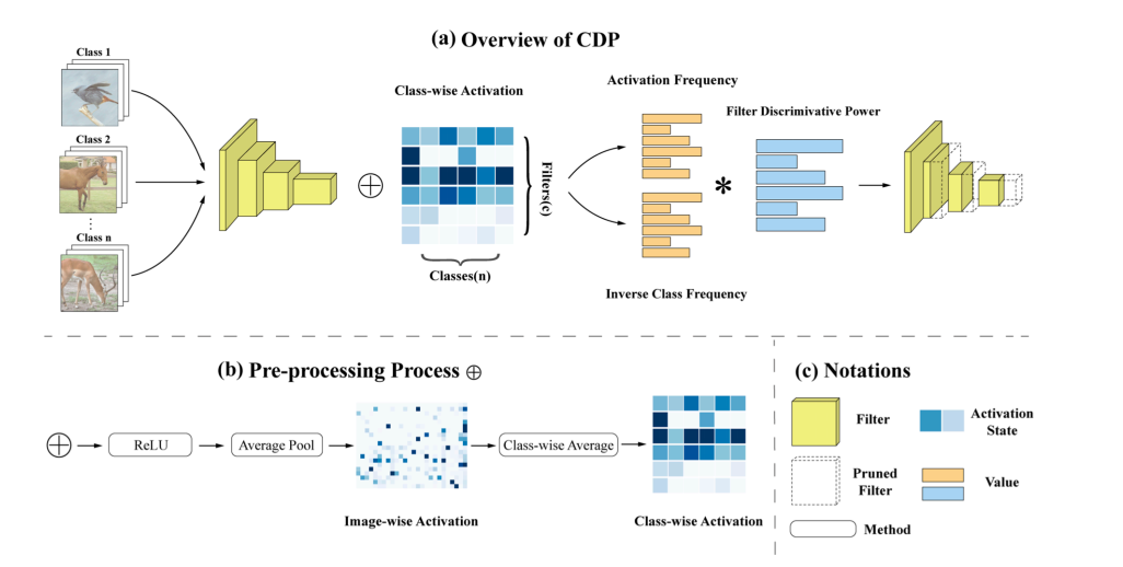 本文的第一作者是信息学院人工智能系2020级硕士生许添硕,通讯作者是信息学院人工智能系晁飞副教授。论文基于传统信息检索算法TF-IDF,提出了根据滤波器类区分度的滤波器剪枝方法(CDP)。不同于传统的剪枝方法,CDP提出了一个新的剪枝理念,CDP将滤波器看做词,而每一层的特征图看做文档,从对文档的重要性来说,不仅出现次数较少的词不重要,在所有文档中频繁出现的词,比如:你、我、的等同样不具有意义。也就是说,极少激活的滤波器与面对所有类的输入都频繁激活的滤波器一样,缺乏对输入特征的区分度,因此可以被剪掉。本文在传统信息检索算法TF-IDF的基础上,针对CNN的特点进行优化,计算每个滤波器的类区分度,最后将得分低的滤波器剪掉。特别的,CDP不需要任何动态搜索过程以及迭代过程,即可在主流数据集上超越目前的SOTA方法,具有简单、高效的特点。目前前代码已经开源:https://github.com/Tianshuo-Xu/CDP-TowardsOptimal-Filter-Pruning-via-Class-wise-Discriminative-Power.git