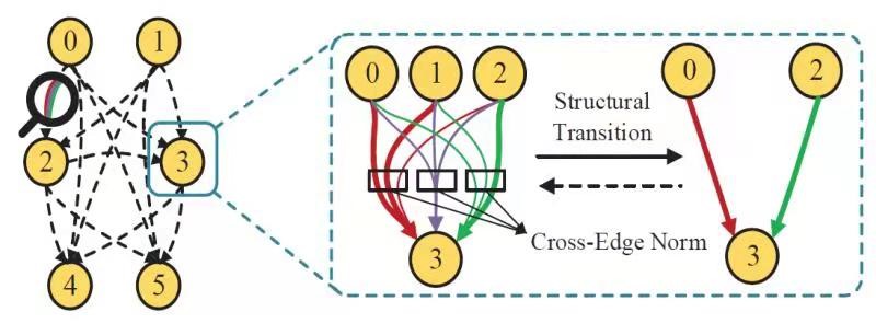 本文的第一作者是信息学院人工智能系2020级博士生周勤勤,通讯作者是信息学院计算机科学与技术系曹刘娟副教授。本文提出在可微结构搜索中引入均衡和一致的优化(Inducing Equalized and Consistent Optimization into DARTS,EC-DARTS),分析了搜索空间的不同算子之间存在的不均衡性以及搜索阶段和重训阶段的结构之间的不一致性问题。通过提出的跨边正规化方法(CrossEdge Normalization)处理不同算子之间的不公平竞争,使对不同算子的搜索优化过程保持相对均衡的状态。为了进一步提高搜索结构的预测性能和真实性能之间的相关性,提出结构转换策略(Induced Structural Transition),通过在搜索过程中构建辅助模型继承超网络的模型权重信息和重训阶段模型的结构信息来提高模型相关性。最终在多个数据集上验证了方法的有效性。