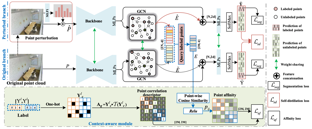 本文的第一作者是信息学院计算机科学与技术系2018级博士生张亚超,通讯作者是信息学院计算机科学与技术系曲延云教授、华东师范大学谢源教授。针对全监督大尺度点云分割任务需要大量完全标注导致的高成本的缺陷。本文提出了一种扰动自蒸馏的弱监督大尺度点云分割方法。借助自监督学习框架,构建了扰动分支,并引入了扰动分支和原始分支之间的预测一致性限制。通过自监督学习,为无标记点引入了附加的监督信息,来约束图卷积层,从而有效地建立整个点云的图拓扑关系,从而实现标记点和未标记点之间的信息传播。除了在对点云中的点施加监督外,我们还提出了可插拔的上下文感知模块,通过标记点之间的亲和度,来约束特征关系。因此,可以进一步细化点云的图拓扑。在三个大规模数据集上的实验结果表明,与最近的弱监督方法相比,所提方法取得了显著的提升(平均 3.0%),并且所提出的弱监督方法达到了与全监督方法相媲美的结果。