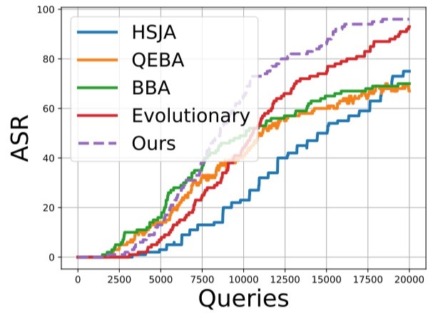 本文的第一作者是信息学院人工智能系2019级博士生李杰,通讯作者是信息学院人工智能系纪荣嵘教授。本文针对硬标签查询的黑盒攻击问题,提出了一种有效利用历史先验动态更新的攻击算法(Adaptive History-driven Attack)。该算法从目标类别图片出发,采用改进的随机游走策略以接近原始图像。为了加速优化,算法将之前的查询信息作为先验知识指导当前采样。同时为了平衡迭代过程中的探索与利用,算法基于与输入图片距离缩小的实际值与期望值的比值动态调整两个方向的系数。该算法有效提升硬标签黑盒攻击效率,并在模拟场景和真实线上API场景下得到了验证。