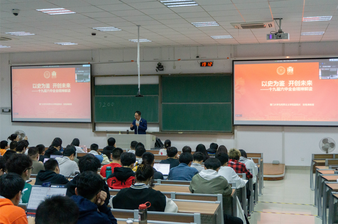 为深入贯彻学习党的十九届六中全会精神, 11月22日晚,信息学院邀请厦门大学马克思主义学院副院长张艳涛教授于翔安校区学武楼A401教室开办专题辅导报告,并于分会场A201、C201同步直播。信息学院辅导员、学生党员、入党积极分子、团员青年代表等参加会议。