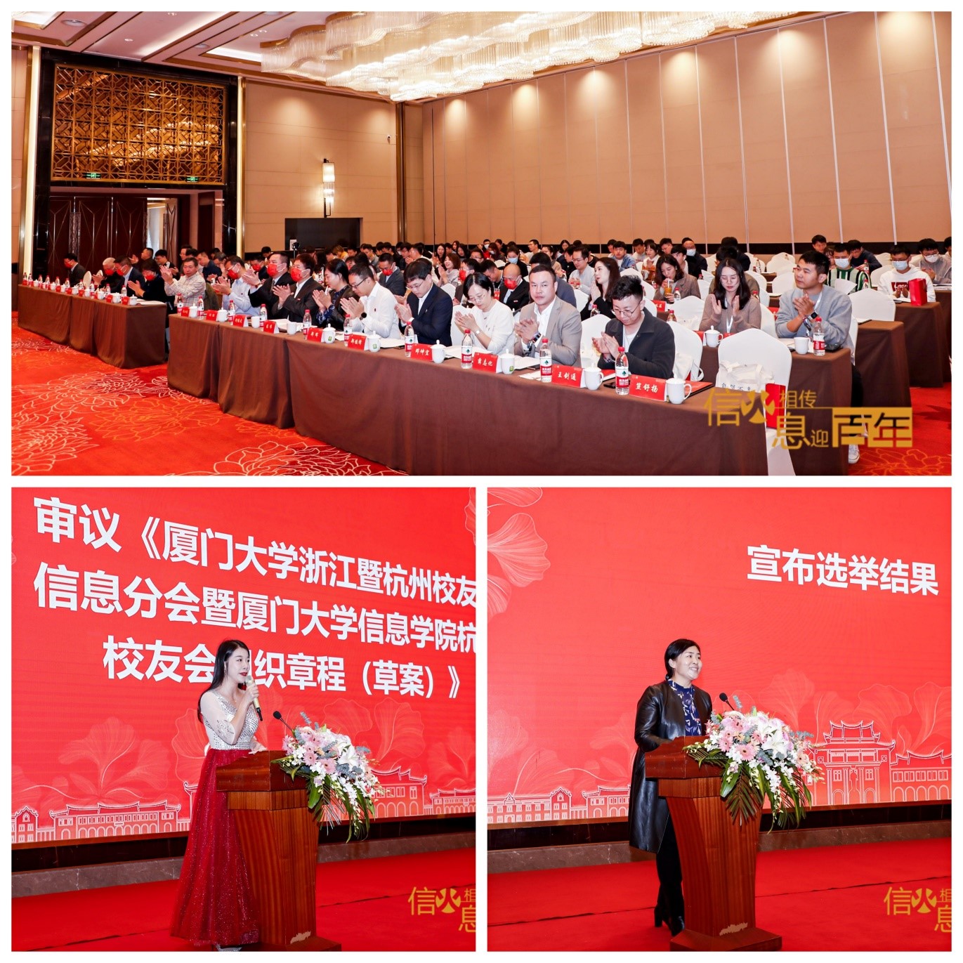 2021年11月14日下午,厦门大学浙江暨杭州校友会信息分会暨厦门大学信息学院杭州校友会成立大会在杭州千越君亭酒店钱江厅隆重召开。厦门大学校友总会副理事长赖虹凯、秘书处秘书长张伟、副秘书长郑辉一行,信息学院党委书记刘弢、院长舒继武、党委副书记郑镇锋以及各系教师代表,厦门大学浙江暨杭州校友会执行会长徐振晓、秘书长余秀旸及理事成员、兄弟分会会长,信息学院兄弟校友会秘书长代表出席大会,学院在杭百余位校友齐聚一堂,畅叙母校情谊,共同见证厦门大学信息学院杭州校友会的成立。大会由厦门大学浙江暨杭州校友会外文分会秘书长笪舒扬主持。