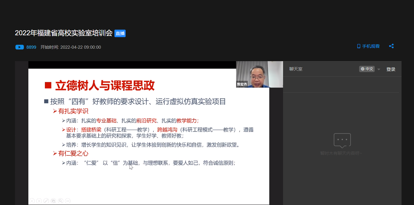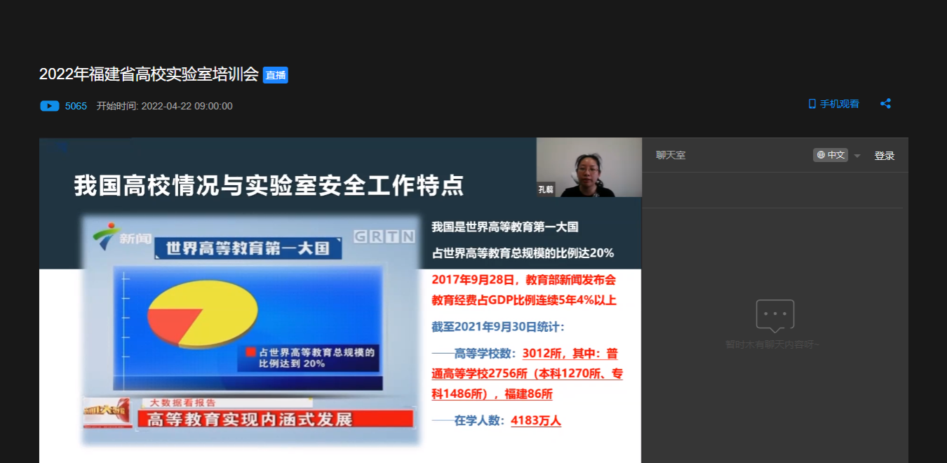 2022年4月22日下午,2022年福建省高校实验室工作培训会通过“线上+线下”混合方式举办,培训内容包括高校实验室安全管理和虚拟仿真实验课程建设。中心林子雨等老师以线上形式参加了本次会议(林子雨 供稿)。