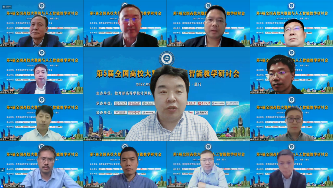 北京理工大学王国仁教授分享了北京理工大学在“拔尖创新人才”培养模式方面的探索和经验,包括工科学生理科培养、知能合一培养体系、大师引领才俊支撑、全员竞赛强化算法、产教协同问题驱动、创新创业学分招标。国家级教学名师浙江工业大学王万良教授对人工智能专业建设、一流课程的内容与建设以及虚拟教研室的建设,进行了专业而有深度的解读。华南师范大学蒋运承教授介绍了华南师范大学人工智能专业的人才培养体系,重点介绍了人工智能专业产学研合作协同育人体系的探索和实践,并介绍了在师范院校开设人工智能专业人才培养的一些体会和经验。作为全国首批人工智能获批专业,天津大学人工智能专业经过3年的建设发展与探索,初步形成了具有新工科特色的人工智能专业人才培养方案和课程体系,天津大学人工智能学院王鑫教授在报告中系统介绍了天津大学的探索与实践经验。中南大学是教育部首批批准设立大数据专业的三所高校之一,在大数据专业建设方面走了全国高校的前列,作为大数据专业负责人,张祖平教授对于如何建设好这个新工科专业,有着很深的理解,并在报告中做了深度分享。浙江大学胡浩基副教授分享了机器学习课程与教材建设的经验。中国人民大学朝乐门副教授结合自己主讲的国家级一流本科课程《数据科学导论》的建设,分析讨论了面向数据科学的Python语言教学中常见的问题与思路,并分享了数据科学导论类课程的课程思政建设的心得体会。电子科技大学李文江副教授做了题为《基于项目的分级递阶式课程体系建设——人工智能类课程在自动化专业的改革探索》的报告。厦门大学信息学院计算机科学与技术系林子雨副教授分享了厦门大学在大数据课程体系建设方面的成果和经验。