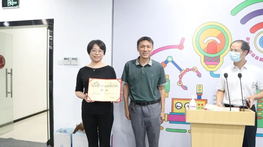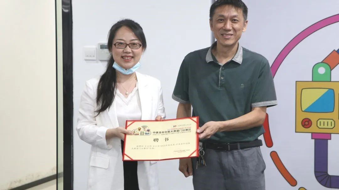 石江宏教授还为洪歆慧教授与王志玮教授亲自颁发中美青年创客大赛厦门分赛区导师聘书并合影留念。