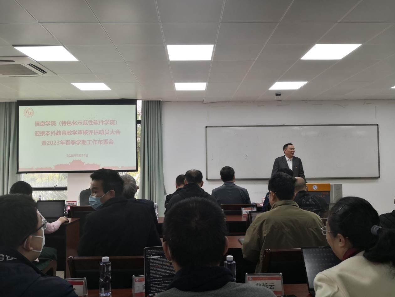 2023年2月14日下午,厦门大学信息学院(特色化示范性软件学院)迎接本科教育教学审核评估动员大会暨2023年春季学期工作布置会,在海韵园行政楼A201举办。会上,学院舒继武院长做了2023年学院重点工作的报告,廖明宏副院长做了关于本科教育教学评估的报告。中心全体老师参加了本次会议。