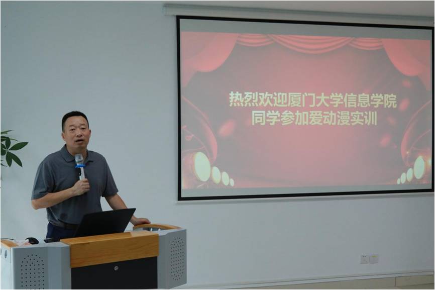 随后,爱动漫国家基地副总经理黄家扬对厦门大学信息学院数字媒体技术专业师生们的到来表示热烈欢迎,并为学生们介绍了去年的实训的情况,重点讲解了数媒技术专业今年这一期实训的重要性,针对课程、师资以及应用能力做了优化,希望学生在实训期间,可以自我成长、自觉提高、自律创新,在实训中寻求方向、在方向上找到目标、在目标里有所突破。