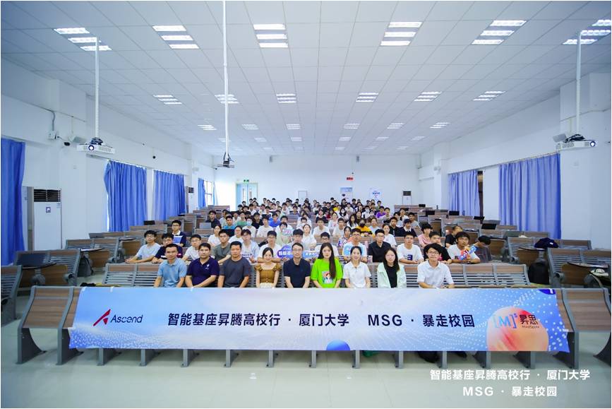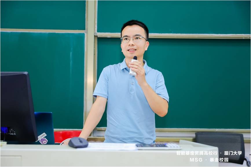 7月8日,“智能基座”昇腾高校行暨MSG·暴走校园厦门大学专场活动在厦大翔安校区举行,此次活动由华为技术有限公司、厦门大学教务处主办,厦门大学信息学院实验教学中心、福建人工智能创新中心承办,厦门大学华为智能基座社团协办,旨在推动人工智能技术在高校的落地、促进人工智能产业与教育相互融合,为我国人工智能产业发展积蓄力量。厦门大学信息学院团委副书记刘长青老师、信息学院实验教学中心副主任谢作生老师和杨帆老师出席活动。昇腾生态运营经理吴丹萍、昇腾计算生态技术专家曾鹏源、昇思MindSpore技术生态专家杨滔等参加活动并做了主题分享。