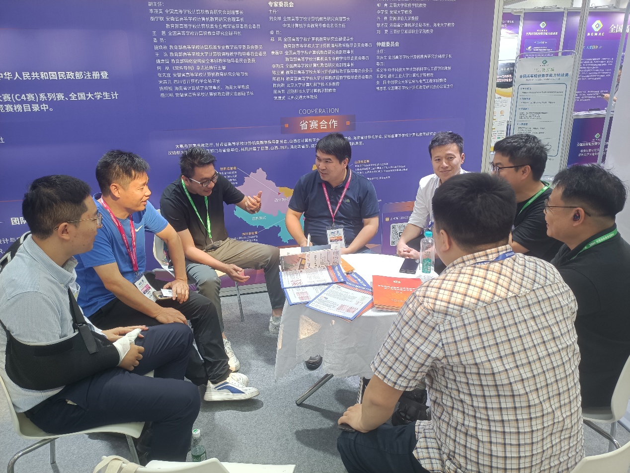 在高校仪器设备展览展示厅,我们一起参观了与教学相关的仪器设备并与相关厂家作了深入的交流。特别地,谢作生老师与华为、头歌的项目负责人一起交流讨论关于算力设备应用在教学方面的问题,提出了一些亟待解决的问题。双方在设备测试和今后应用部署等方面达成一致的意见。