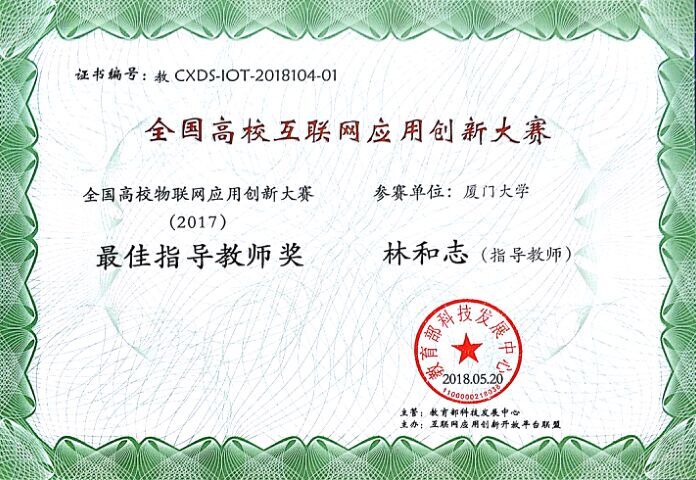 由教育部科技发展中心和互联网应用创新开放平台联盟主办的“第五届全国高校物联网应用创新大赛”全国总决赛于5月18—20日在苏州职业大学图书馆隆重举行。经过激烈的角逐,我校学子荣获本次大赛唯一的全国特等奖。这是我厦学子继2017年在该赛事总决赛中取得二等奖后,再次取得的好成绩。